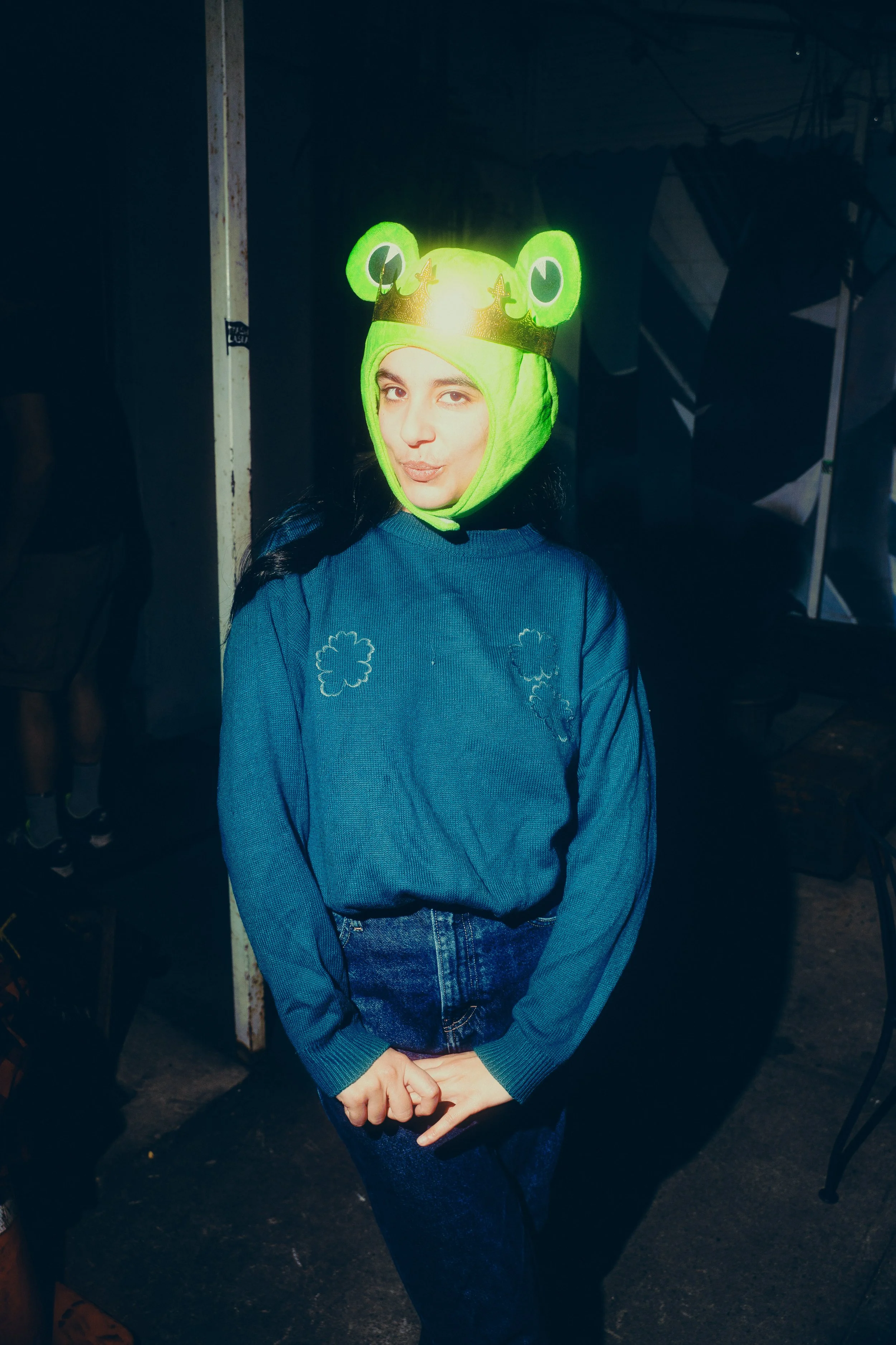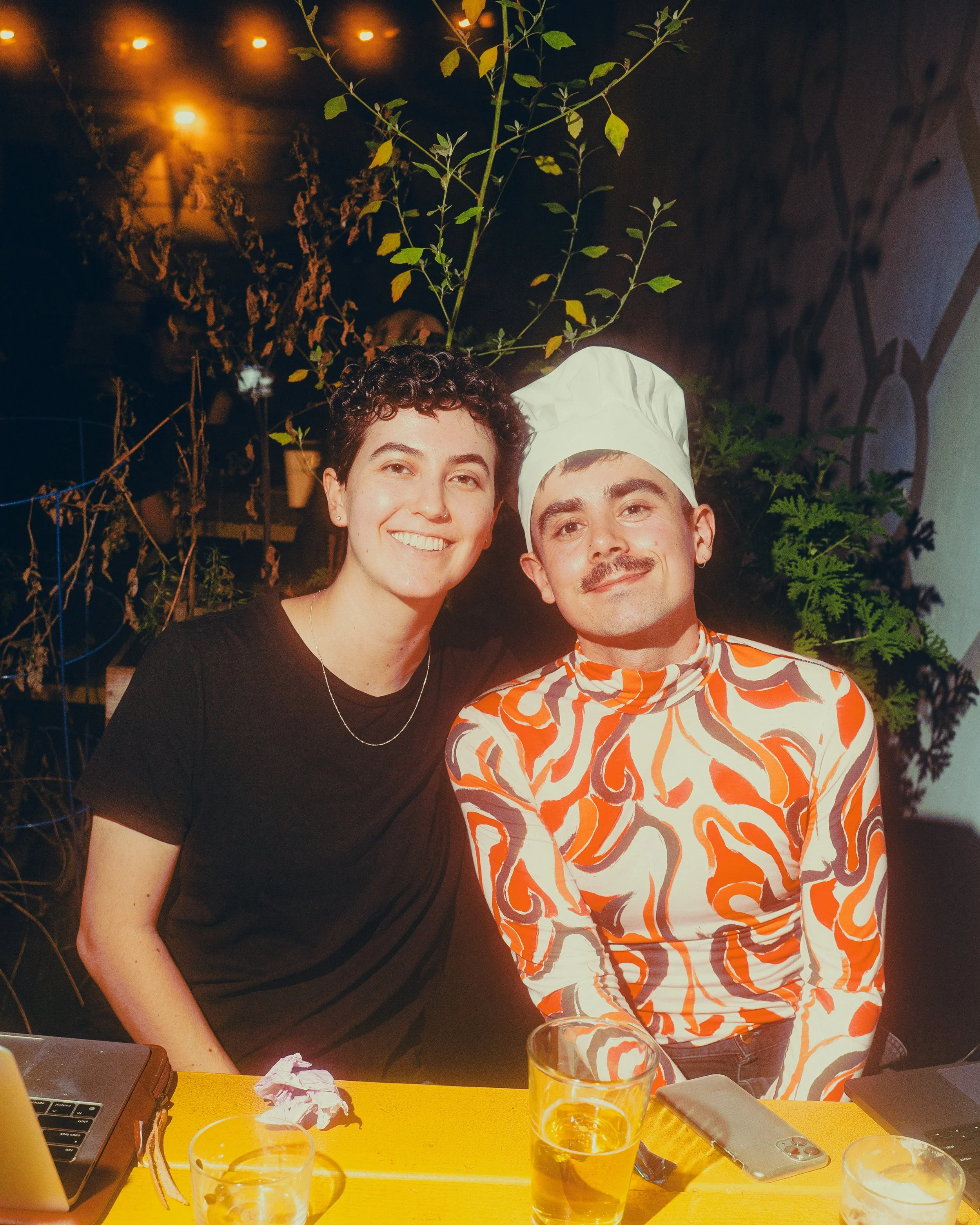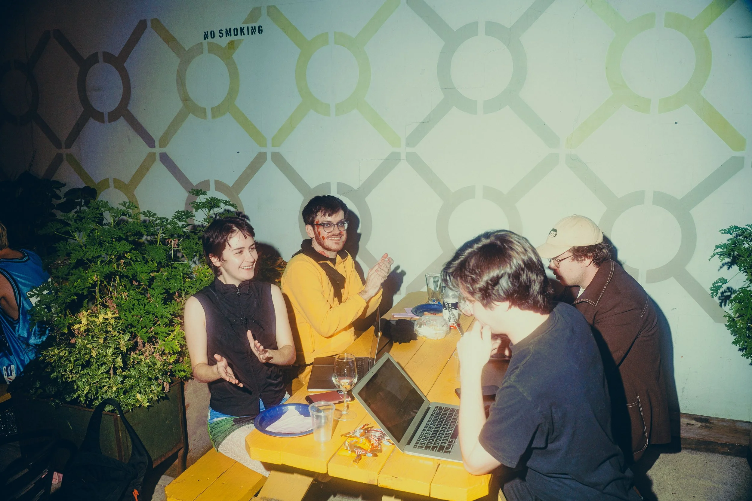 Three young people sitting at a table in a cafe or workspace, working on laptops, in the backyard of a bar at a fun Halloween event.