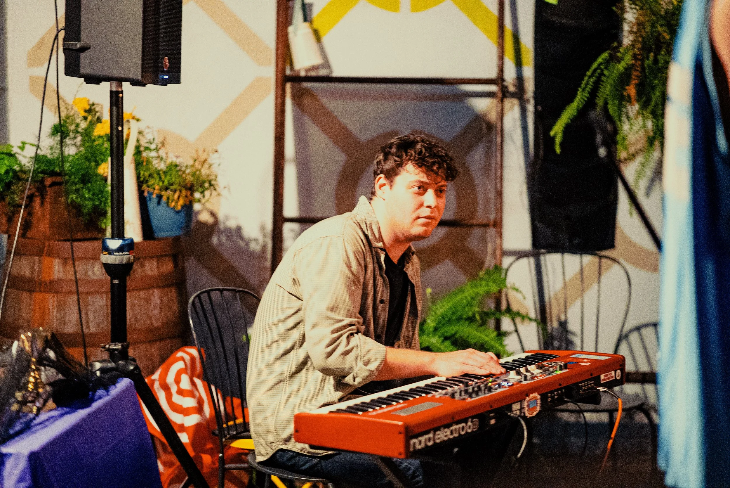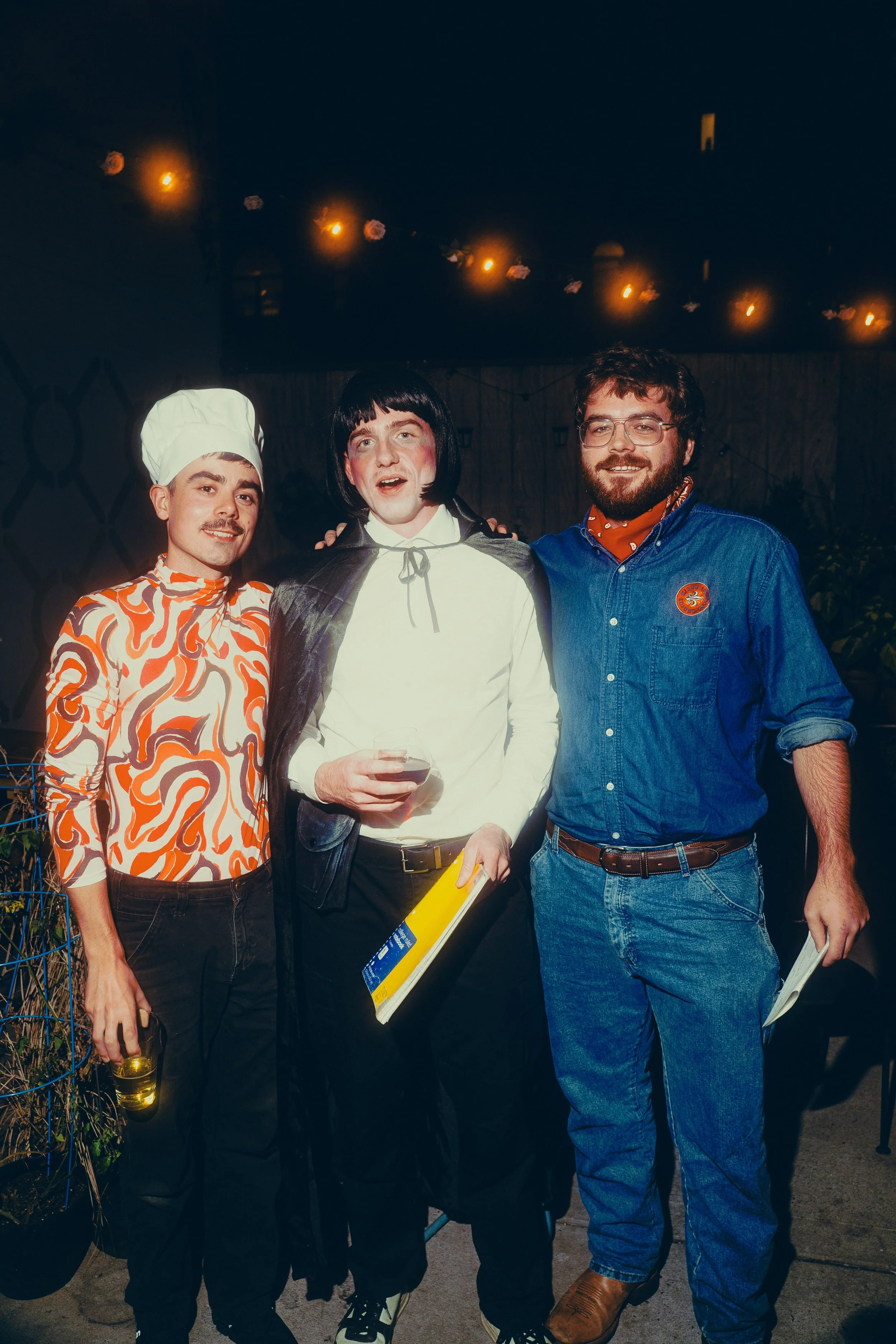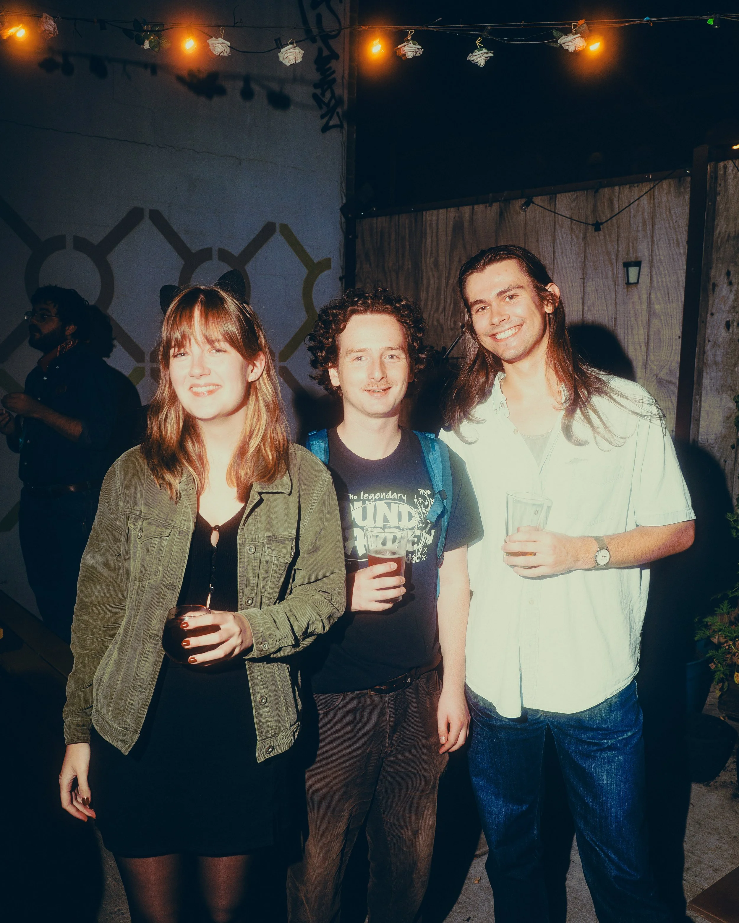 A group of people sitting and standing, laughing and enjoying an event in the backyard of a bar at a fun Halloween event decorated with plants and string lights, with a guitar and microphone on a stand in the foreground.