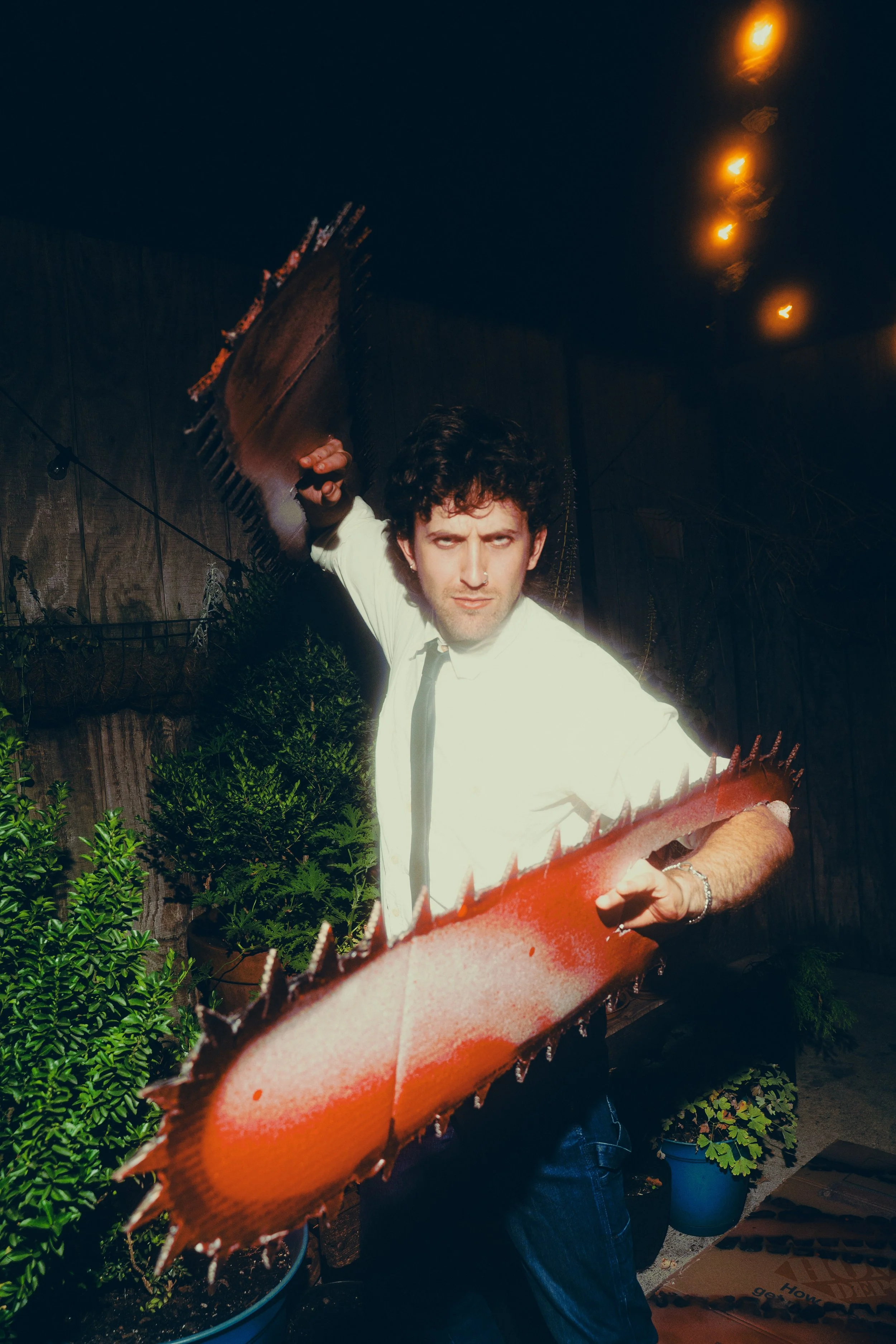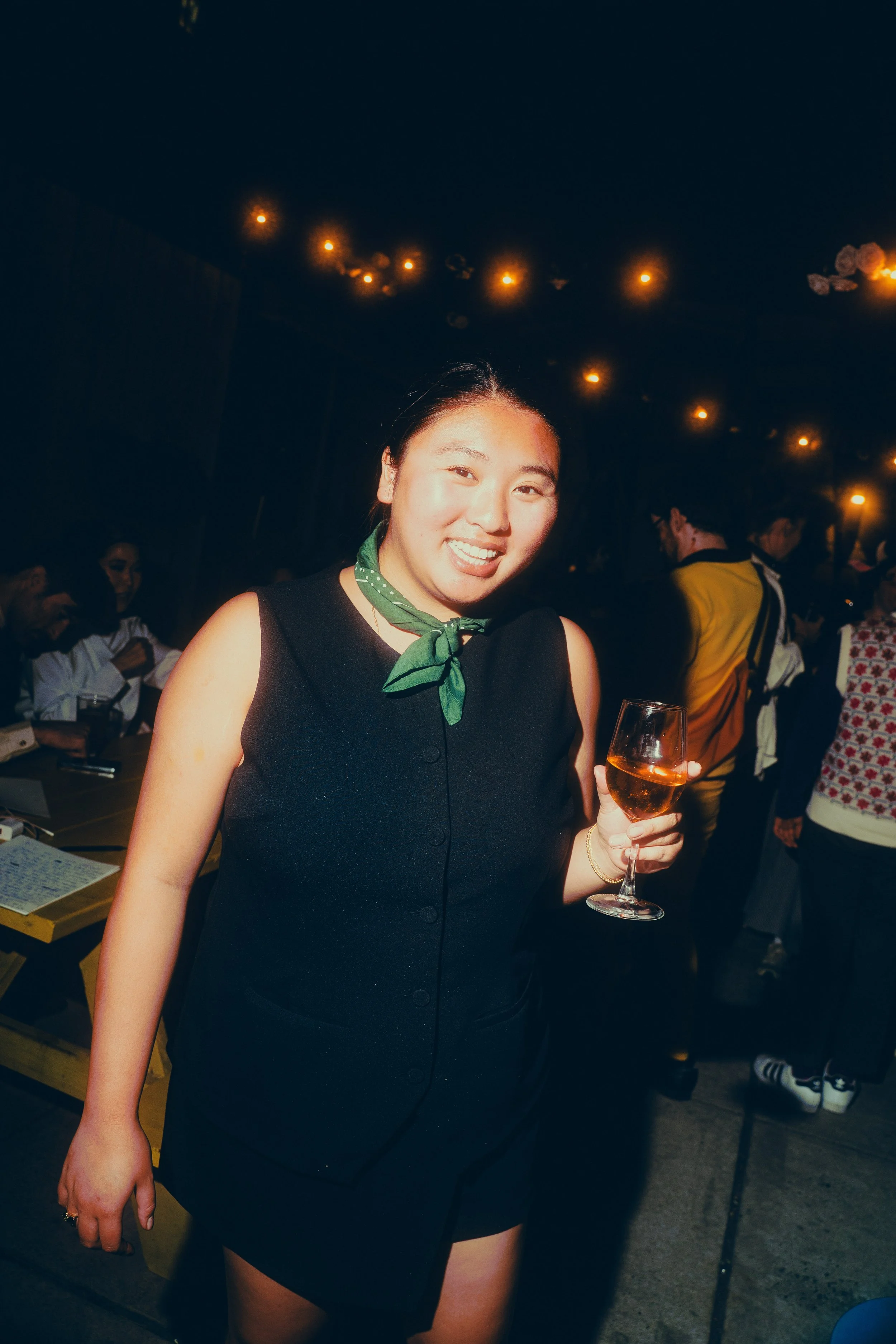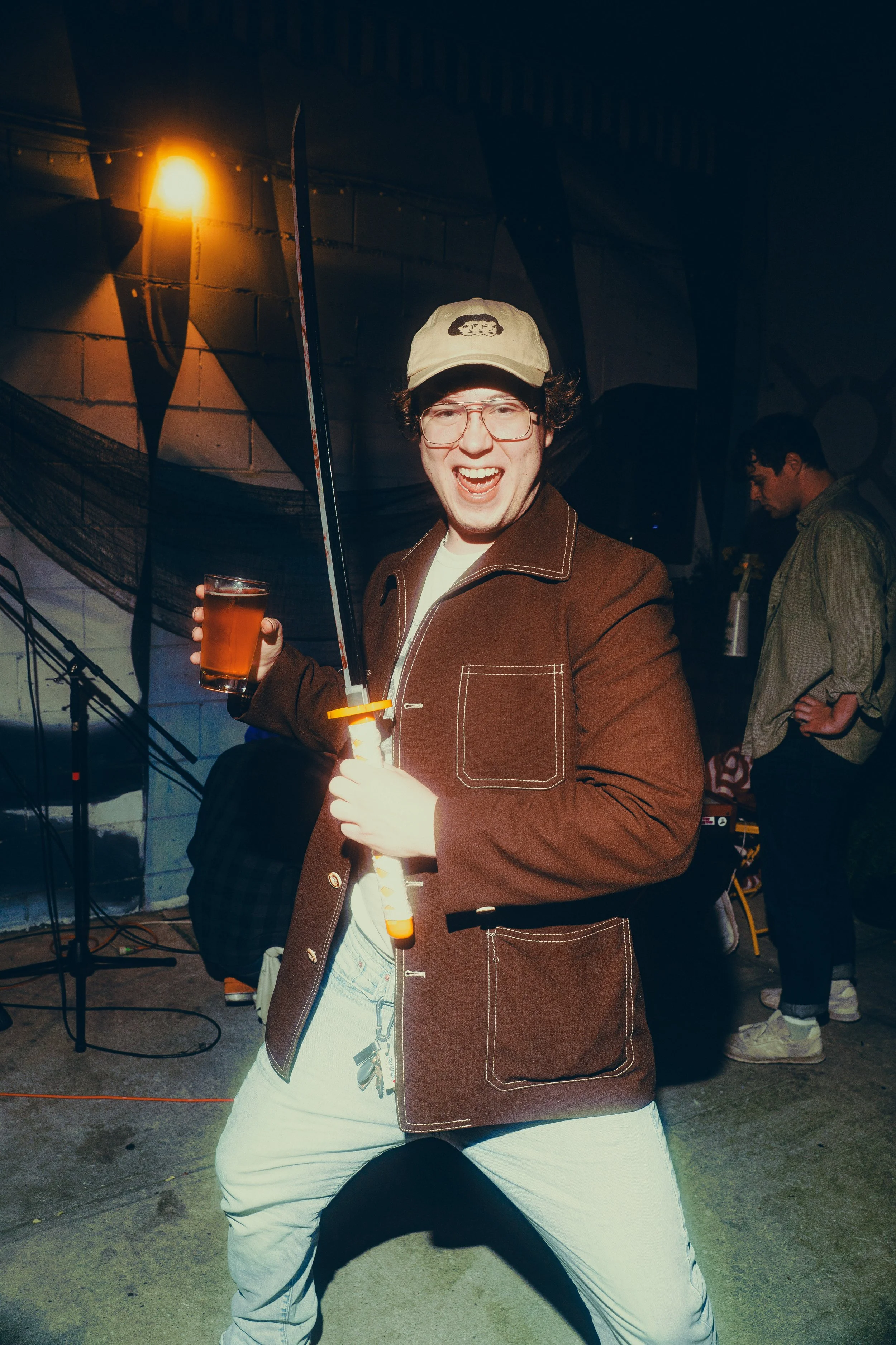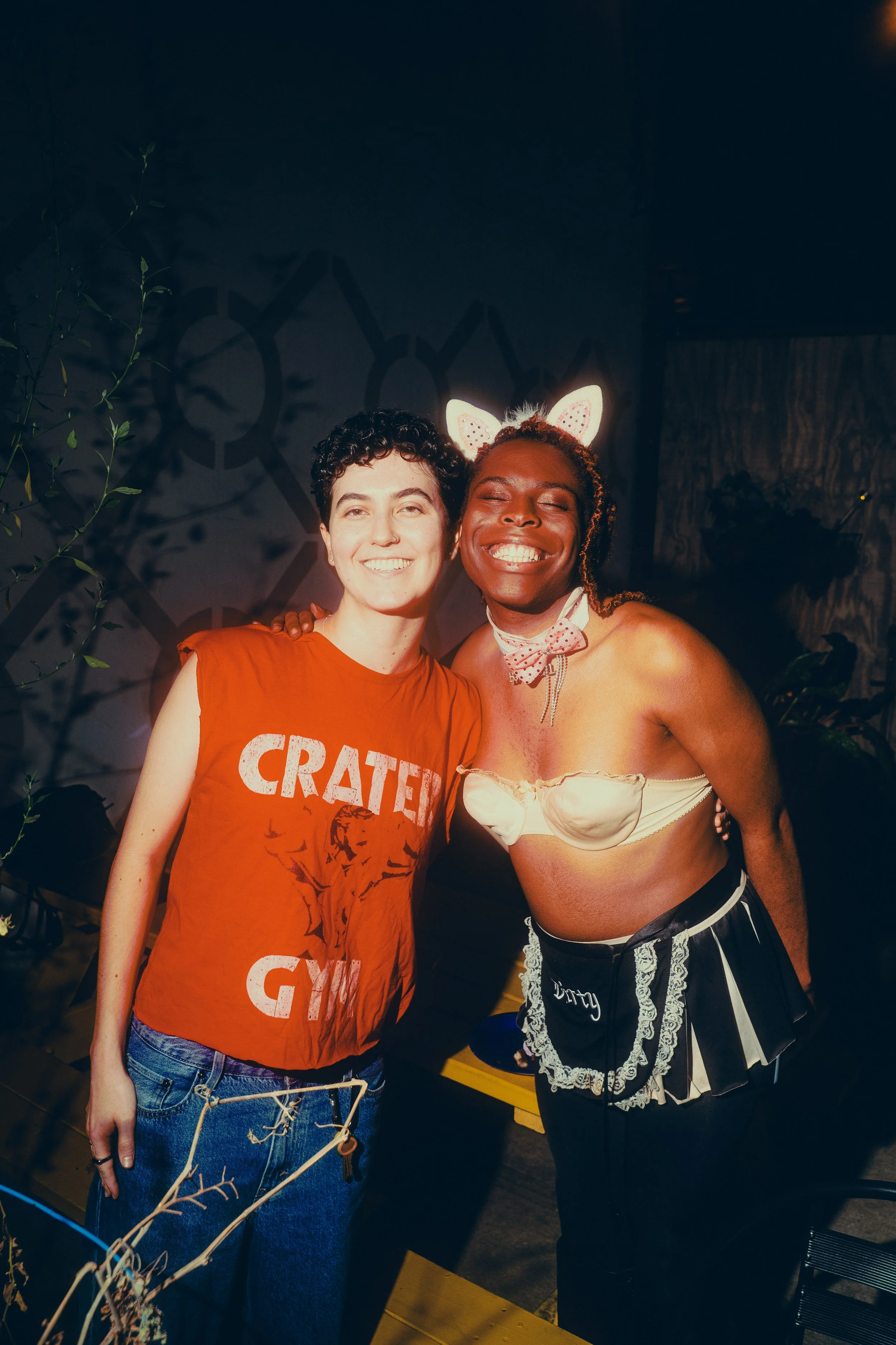A group of people sitting and standing, laughing and enjoying an event in the backyard of a bar at a fun Halloween event decorated with plants and string lights, with a guitar and microphone on a stand in the foreground.