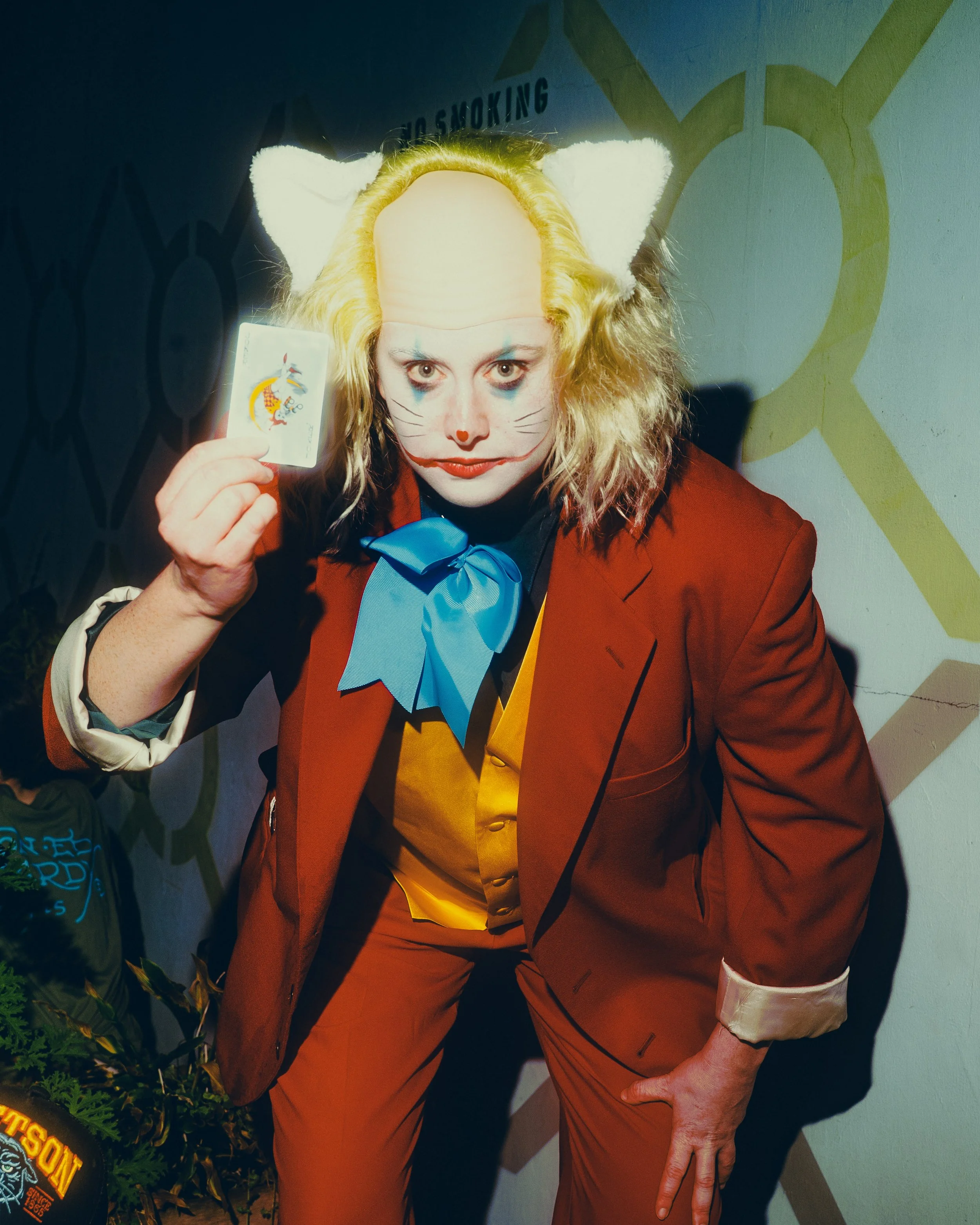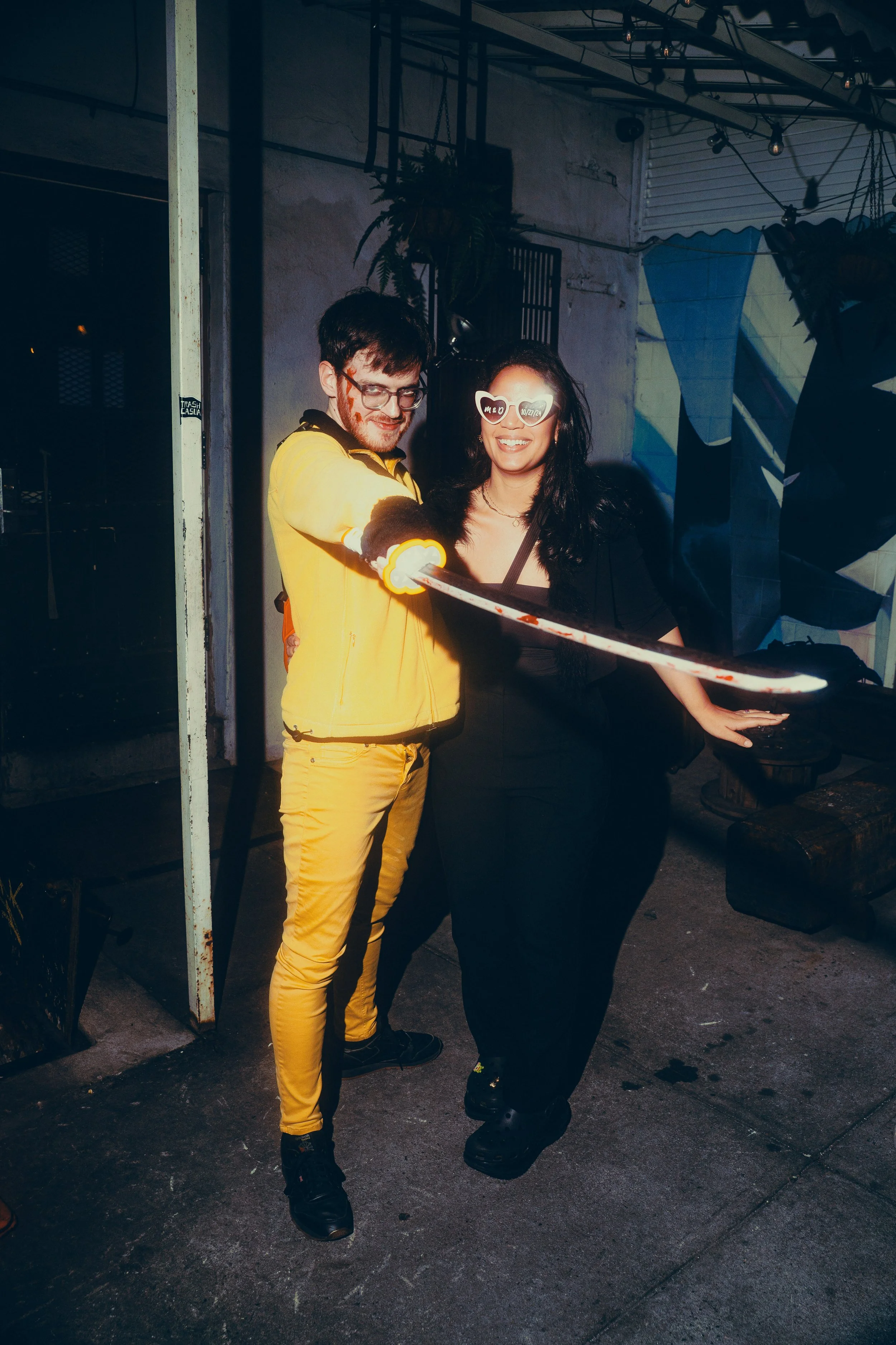 People in costume, laughing and enjoying themselves in the backyard of a bar at a fun Halloween event.