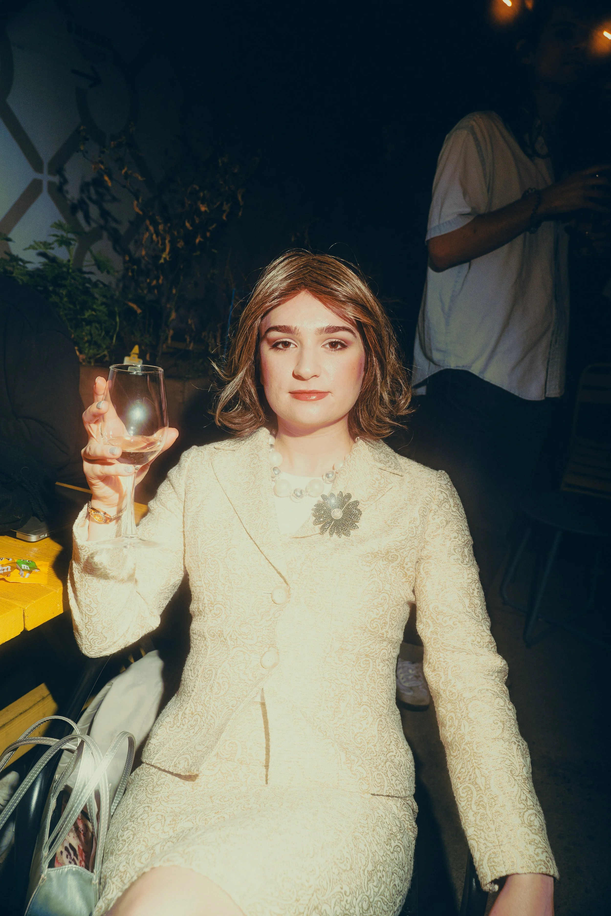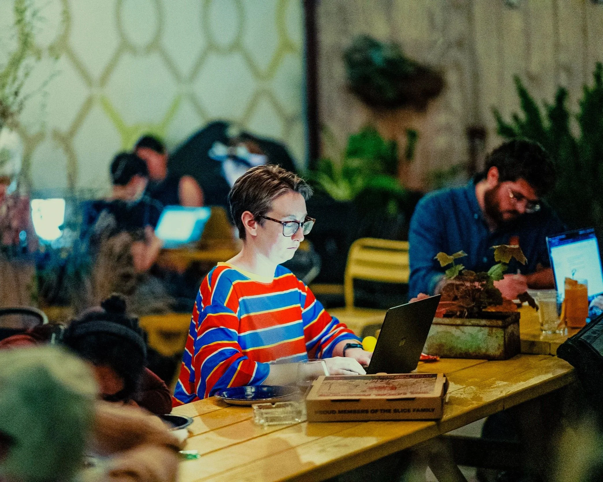 Young person with short hair and glasses working on a laptop at a wooden table in the backyard of a bar at a fun Halloween event, surrounded by others using electronic devices.